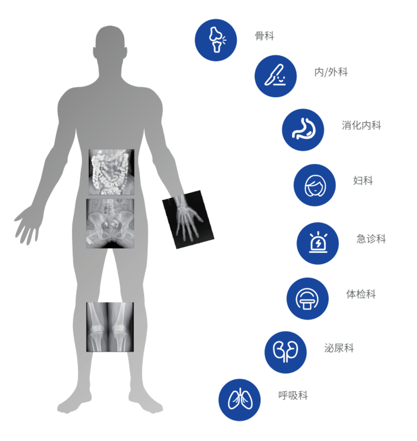 動態(tài)DR集常規(guī)拍片、胃腸、透視、造影于一體,可應用于臨床各科室,如體檢科、內科、外科、骨科、急診科等,臨床用途更加廣泛。