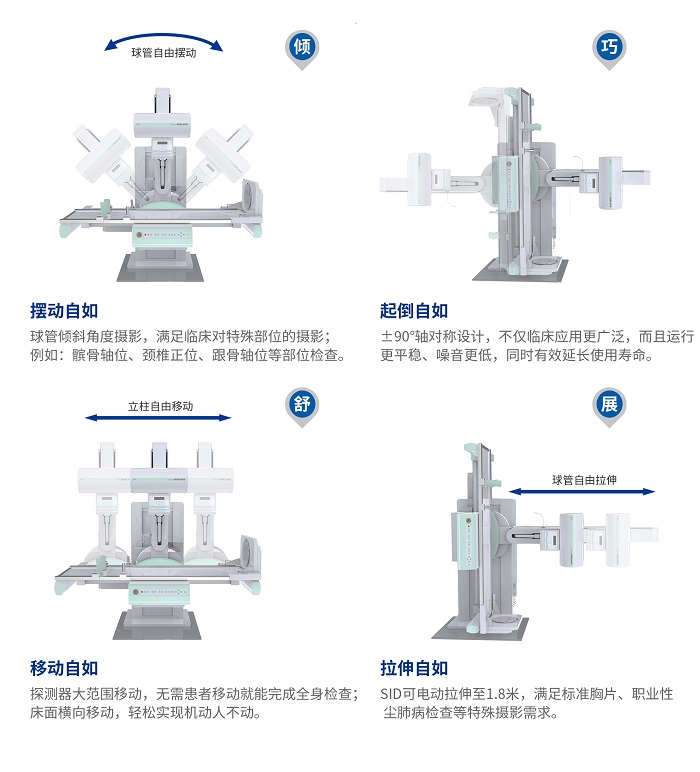 對稱設(shè)計床體,配合球管大角度傾斜,可實現(xiàn)無死角擺位,滿足臨床各部位、各角度的攝影需求;SID可電動拉伸至1.8米,滿足標準胸片和塵肺病鑒定檢查需求;床體起倒自如、移動自如,應(yīng)用廣泛,操作便捷。