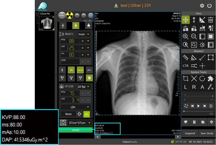 DAP是指射線累計(jì)劑量與照射面積的乘積值,表示照射人體的射線總數(shù)。由于醫(yī)護(hù)人員受到的輻射照射來(lái)自主射線束穿過(guò)患者時(shí)產(chǎn)生的二次射線。因此,醫(yī)護(hù)人員受到的射線劑量和患者的DAP緊密相關(guān)。搭配DAP輻射劑量監(jiān)控系統(tǒng),可以在圖像上實(shí)時(shí)顯示單次曝光的劑量強(qiáng)度,便于醫(yī)生掌握輻射情況,有效控制劑量攝入,為醫(yī)患提供更多健康呵護(hù)。
